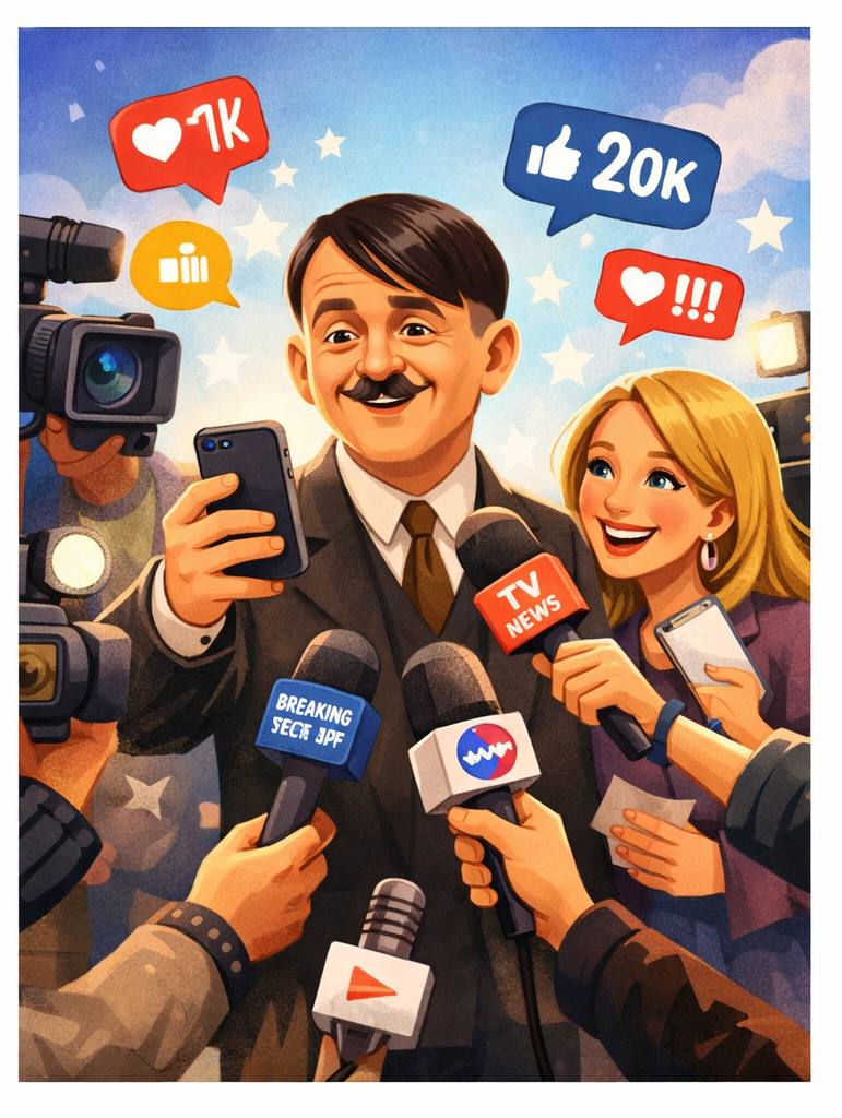 Hitler como celebridade, cercado por microfones e ícones de curtida