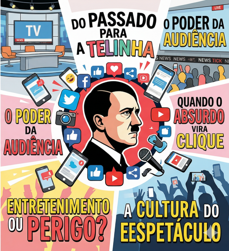 Cultura do espetáculo — Hitler rodeado por celulares, redes sociais e ícones de mídia