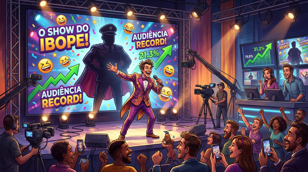 O Show do Ibope — apresentador no palco com sombra militar e gráficos de audiência
